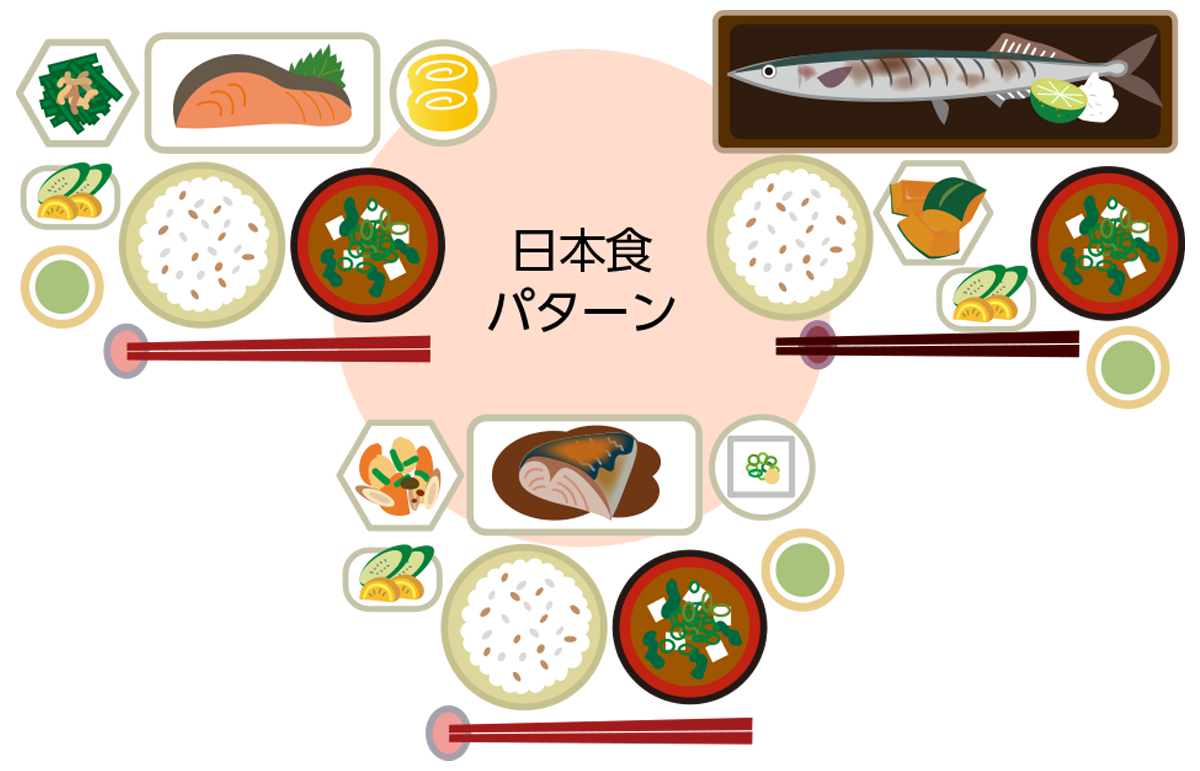①ご飯、②みそ汁、③海草、④漬物、⑤緑黄色野菜、⑥魚介類、⑦緑茶の摂取が多く、⑧牛肉・豚肉の摂取が少ない食事形式は「日本食パターン」と定義されています。