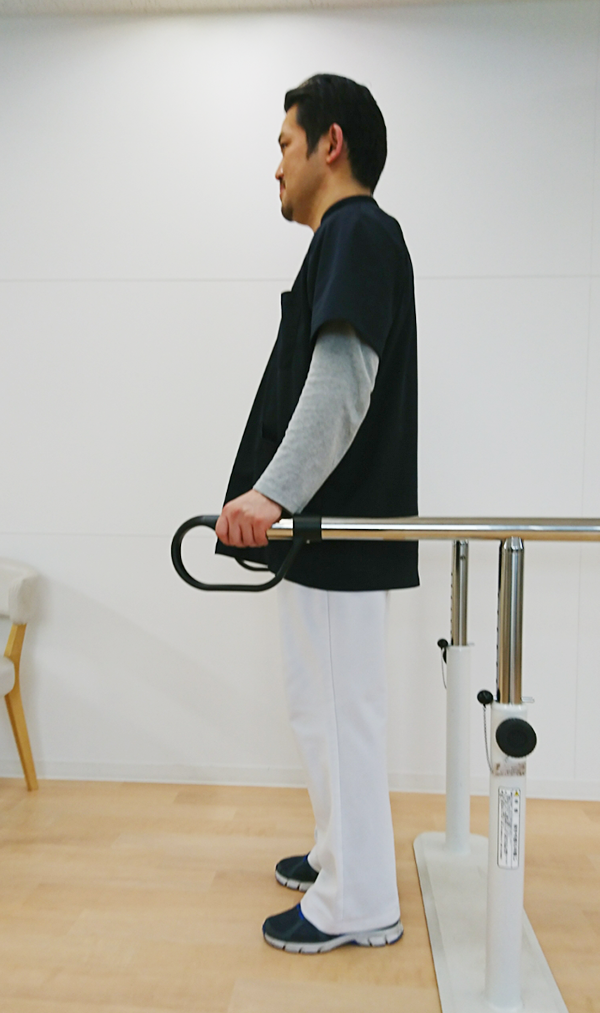 この運動は爪先立ちになるのでバランスを崩しやすいため、下の写真のように手すりにつかまり、踵(かかと)を上げ下げする運動を行います。この運動をふくらはぎが攣ったりしない無理のない回数で実施しましょう。